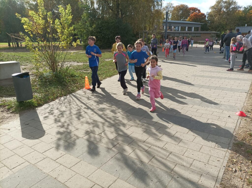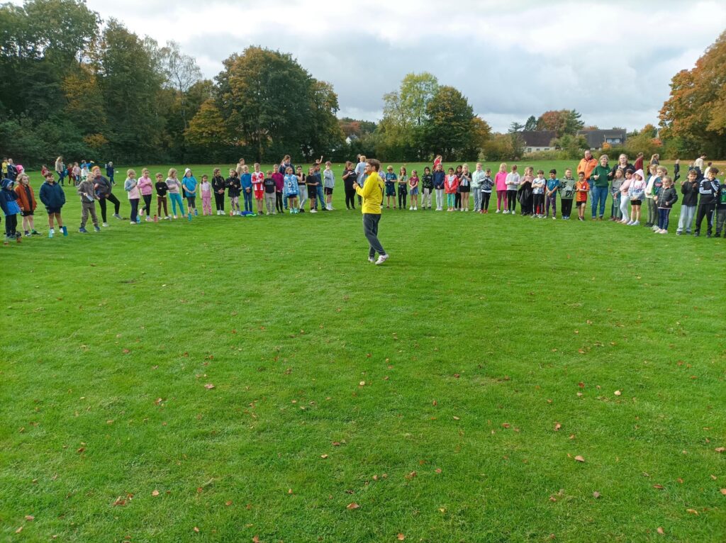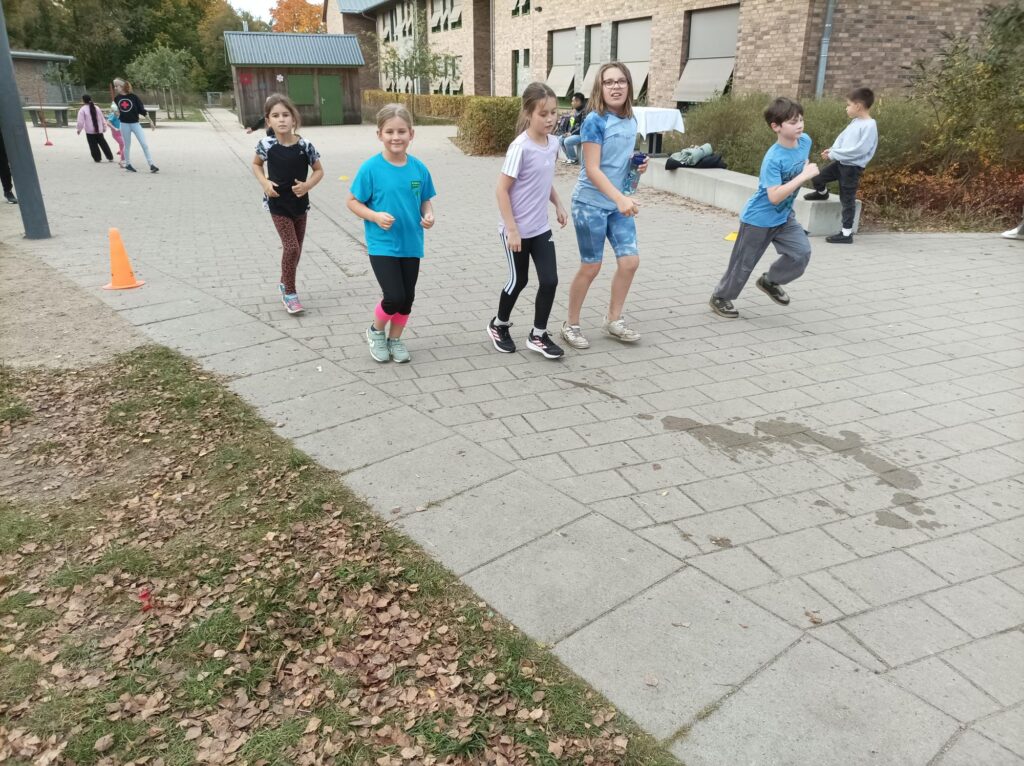 Bei wechselhaftem Wetter liefen nach einer gemeinsamen Aufwärmphase zunächst die Klassen 1 und 2 eine durch Hütchen und Slalomstangen markierte Rundstrecke um den Sportplatz und Schulhof herum. Im Anschluss starteten die Klassen 3 und 4.